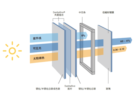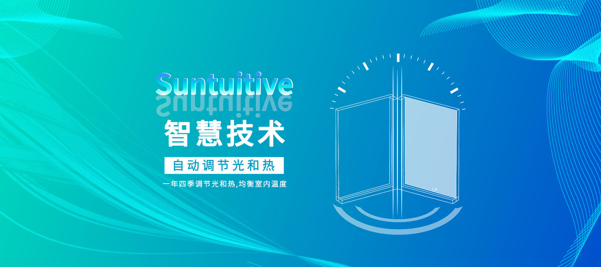 Suntuitive是中空玻璃的夹层外片(朝向太阳的一侧)之间的阳光感应胶片。这种动态玻璃产品因着日光直接照射的热量而自动变色。